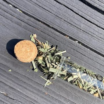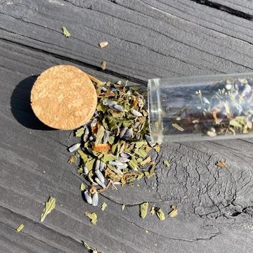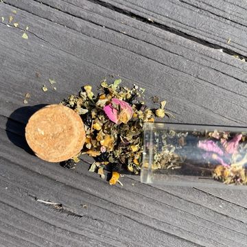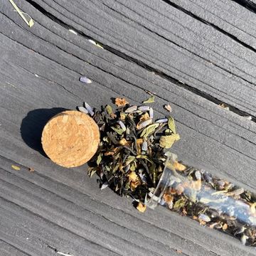 Mugwort base with chamomile, butterfly pea flower, rose petal, lemon balm, and spearmint. (non-caffeinated)